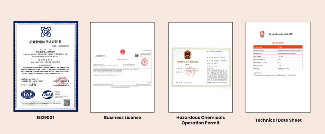 นอกเหนือจากการรับรอง ISO ของเราแล้ว Dotachem ยังได้รับใบอนุญาตประกอบธุรกิจสารเคมีอันตรายอีกด้วย ใบอนุญาตนี้มีความสำคัญอย่างยิ่งในการรับรองว่าการดำเนินงานของเราปฏิบัติตามกฎระเบียบด้านความปลอดภัยและสิ่งแวดล้อมของประเทศเมื่อจัดการกับสารที่อาจเป็นอันตราย