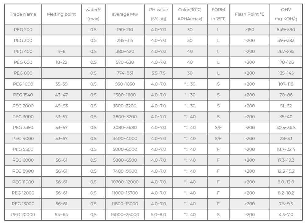 PEG-6000 ขึ้นไป: น้ำหนักโมเลกุลสูง ของแข็งแข็ง มีความแข็งและจุดหลอมเหลวสูงกว่า และมักใช้เป็นตัวช่วยในการแปรรูปโลหะ สารหล่อลื่นแบบเม็ด หรือสารปรับขนาดสิ่งทอ ให้การหล่อลื่นและการกระจายตัวที่ดีเยี่ยม